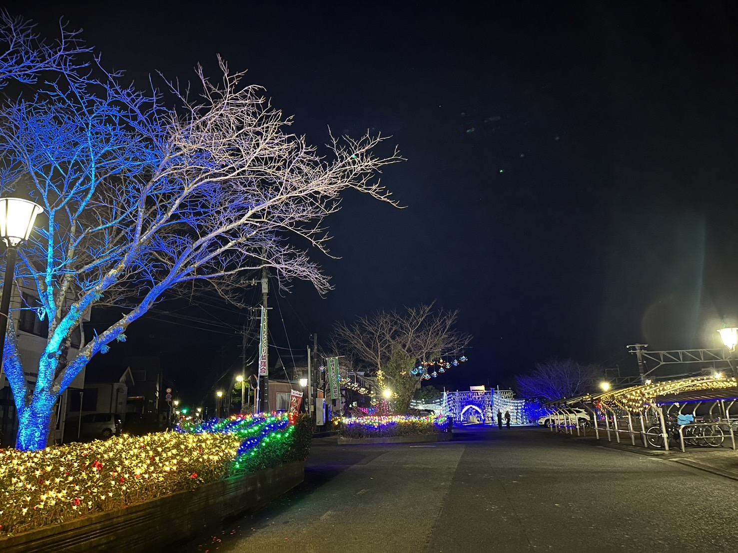 また、駅舎までの道のりも、色とりどりの光に包まれ、眺めながら歩くだけで心がほっこりと和む光景が広がっています。