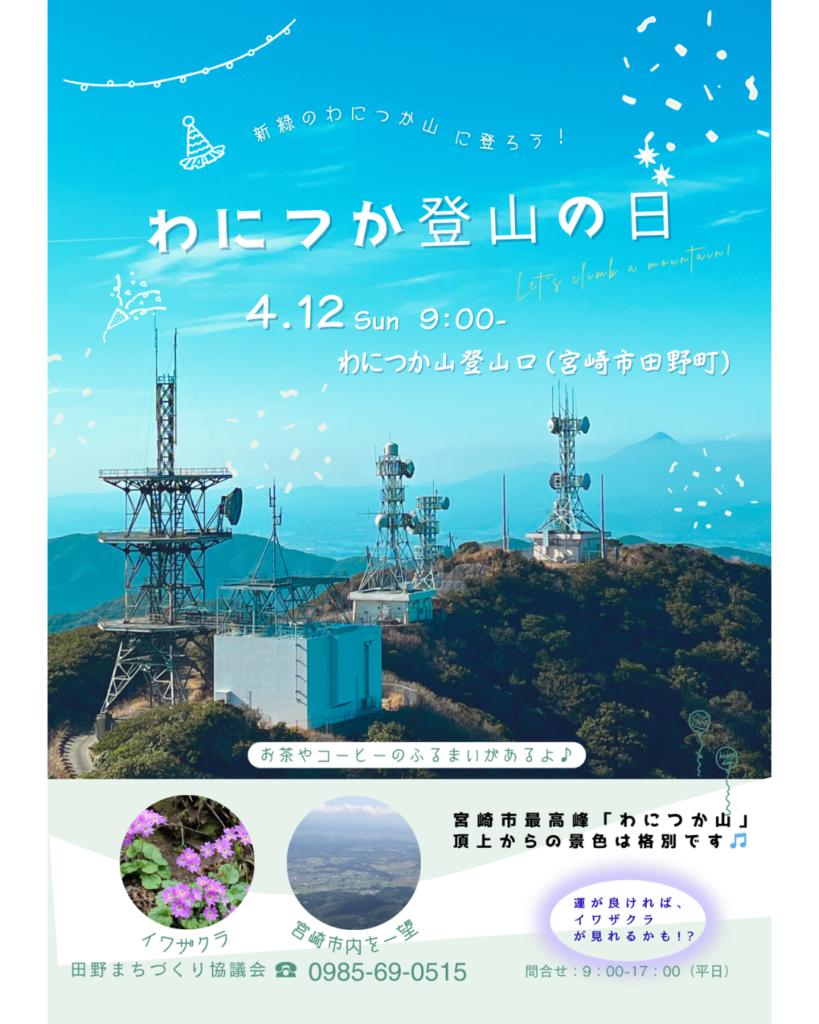 4月12日(日)午前9時に鰐塚山登山口に集合して、みんなでイワザクラ咲く鰐塚山に登りませんか?